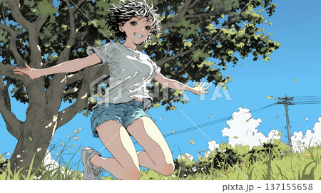 真夏の青空のもと、ヒマワリ畑を散策している若い女性
